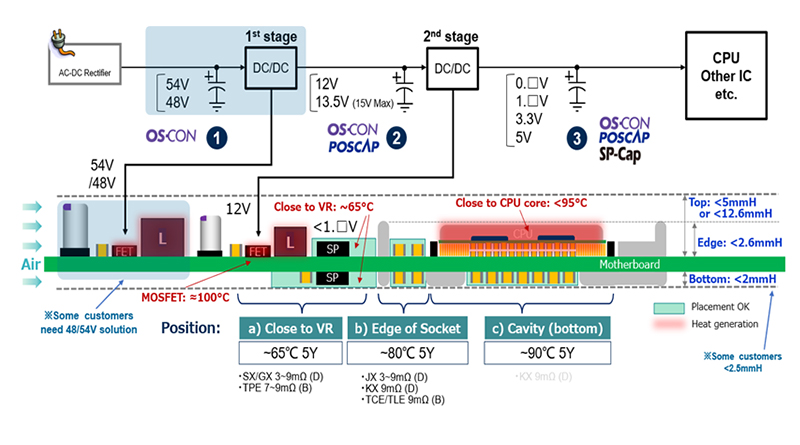 近年來,伴隨著視頻會議、5G通信、云計算等需求的蓬勃發(fā)展,終端客戶對服務(wù)器算力的要求也在不斷提升,CPU發(fā)熱也在上升,為保證服務(wù)器在長時間高溫環(huán)境下能穩(wěn)定運(yùn)行,松下開發(fā)了JX,KX系列高可靠性的新品,可滿足85℃,5年以上的設(shè)計要求。松下獨(dú)有的導(dǎo)電性高分子SP-CAP,POSCAP與OS-CON可廣泛應(yīng)用在服務(wù)器的輸入與輸出端供電線路,其中疊層式高分子鋁電解電容SP-CAP有低高度,大容量,低ESR的特性,主要用于Vccin,Vccfa等線路供電。
